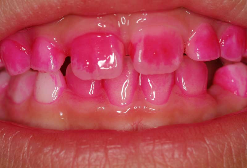 化膿している乳歯の下では、生えかわり準備中の永久歯の歯質も形態も正常な発育が妨げられます。
