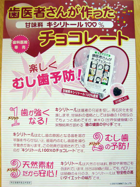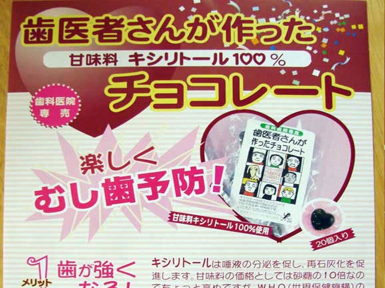 キシリトール 正しいキシリトールの使い方は キシリトール入りのガムやタブレットなど、さまざまな種類が販売されています。気をつけてほしいのがキシリトール含有量です。予防効果を発揮するのは、キ シリトール含有量50%以上のものです。他の甘味料では徐々に耐性菌をつくってしまうので、効果は半減してしまうからです。当院では、キシリトール 100%のガム・タブレット・チョコレートを取り扱っています。 ガムは、毎食後3回、5分以上噛むのが理想。ガムを噛み始めたときの甘い味こそキシリトールです。口の中は甘い味の唾液で一杯になりますが、飲み込んで しまうなんてもったいない。飲み込まずに2分間は口に中にとどめて、キシリトールをいきわたらせることが重要。小さい子供にはちょっと難しいかもしれませ んが、タブレットを噛まずに使用することも有効です。 当医院はキシリトール100%チョコレート『歯医者さんが作ったチョコレート』の岩手県第一号取り扱い歯科医院です。 「チョコレートなんて本当にいいの?」と思われますが、これが結構効果があります。就寝中は唾液の分泌が減少し細菌の活動が活発になるので、そこをねらっ てキシリトールを摂取します。具体的には、就寝前のブラッシング後に「歯医者さんが作ったチョコレート」を一粒口の中で溶かすように食べます。後は、その まま安心して寝ちゃいましょう。目覚めのスッキリ感に驚くことでしょう。