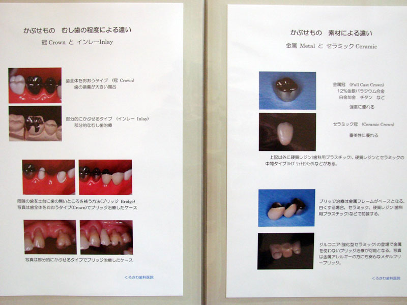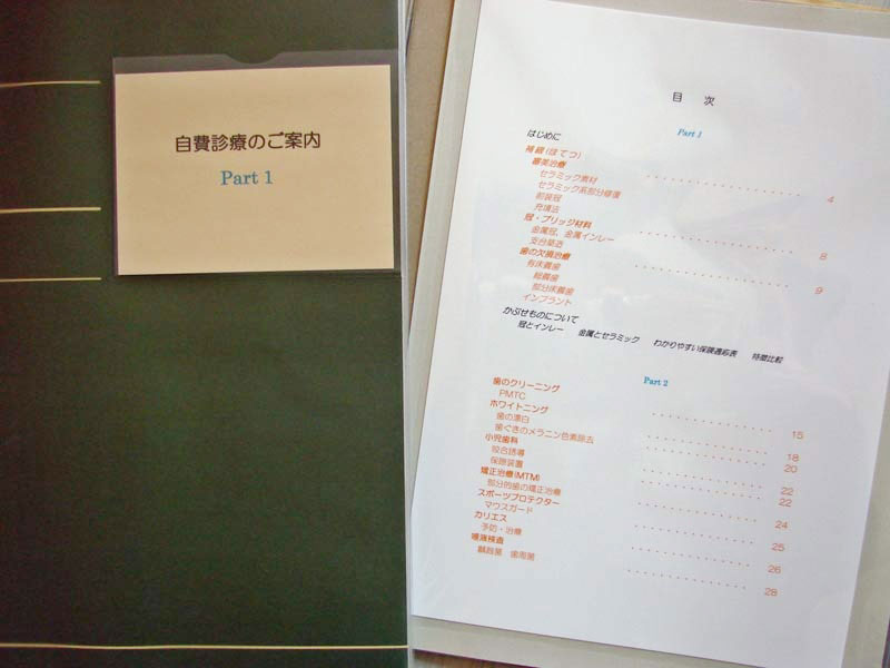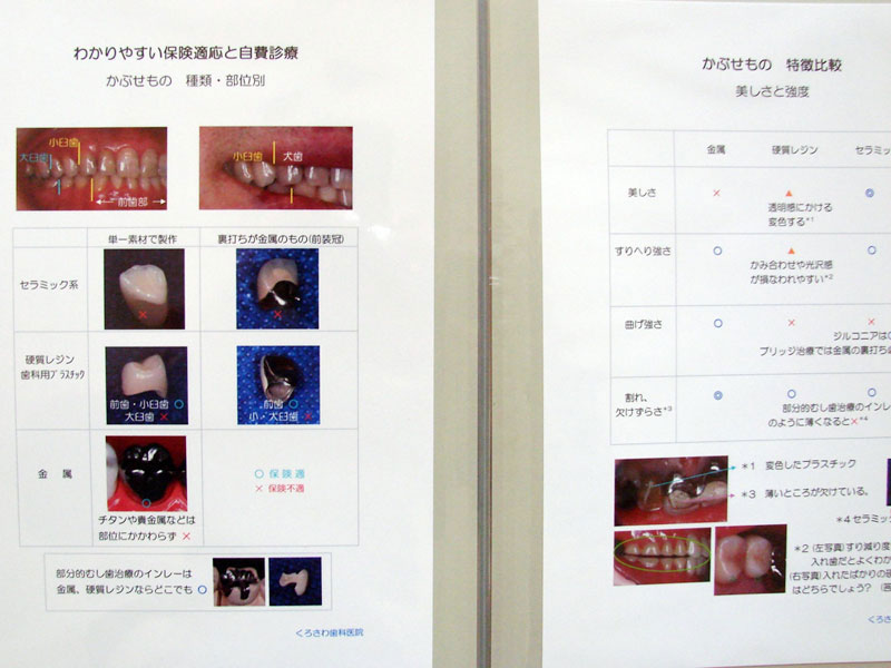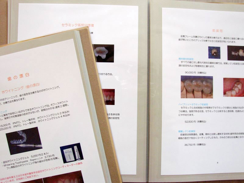 歯科治療の大半は保険診療で行うことができますが、歯科においては全く保険の適応にならない診療と治療内容によっては保険の適応になる治療と自費治療の選択ができる診療があります。前者はおもに歯科矯正や歯科インプラントあるいは予防歯科などです。後者は入れ歯や差し歯のように治療の種類が豊富で保険治療と自費治療の選択が可能な診療です。当院では患者さんごとに口の中の問題点を説明し、治療方法の選択肢をいくつか提示します。そして最適な治療方針を話し合いのうえ決定し、治療を進めるようにしています。 皆様方により快適でご満足いただける治療をはばひろくご理解いただけるよう、当院では待合室に各種治療方法の説明と治療費を掲載した『自費診療のご案内』をおいてあります。良好な口腔健康をとおして全身健康の向上に少しでもお役に立てればと思います。