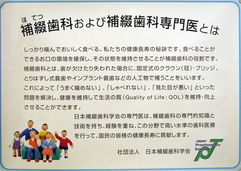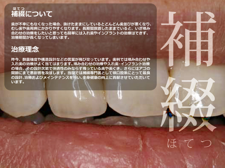 >昨今、耐震強度や構造設計などの言葉が飛び交っています。歯科では噛み合わせや入れ歯の治療がよく当てはまります。噛み合わせの治療や入れ歯・インプラント治療の場合、その設計次第で快適性のいならず残っている歯や歯茎、さらにはアゴの関節にまで悪影響を及ぼします。当院では補綴専門医として顎口腔系にとって最良の設計、治療およびメインテナンスを行い、全身健康の向上に貢献させていただいています。本ホームページに用いられている症例写真は全て当院で治療を受けられた患者様の写真です。説明用写真としての提示を快く承諾していただき感謝申し上げます。