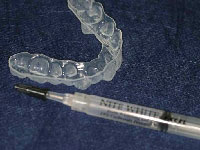 ホームホワイトニング 専用のトレーと薬剤で自宅にいながらできるホワイトニング法。オフィスホワイトニングと比較し、後戻りや知覚過敏の症状が少ないが、期間はかかる(通常2週間)。